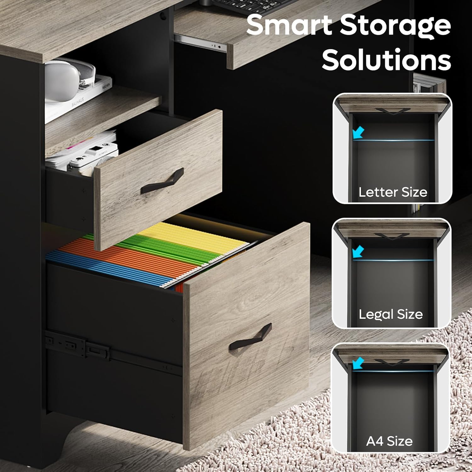 Versatile Storage: This large desk features 2 open storage compartments, a storage drawer, a file drawer for letter/A4/legal-size hanging file folders, and a dust-free storage cabinet, offering a variety of storage options to keep your workspace organized and your essentials dust-free